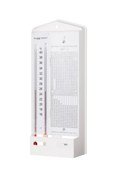 Гигрометр психрометрический. Прибор для измерения относительной влажности и температуры воздуха в помещениях. Изготовлен по ТУ25-11.1645-84. Имеет «Свидетельство об утверждении типа средств измерений».Состоит из пластмассового основания, на котором закреплены температурная шкала с двумя капиллярами, резервуар одного из которых увлажняется фитилем из ткани, опущенным в питатель с водой, и таблица для определения относительной влажности воздуха по разнице показаний «сухого» и «увлажненного». Питатель закреплен с внутренней стороны основания. Шкальная пластина и таблица – металлические.Технические характеристики